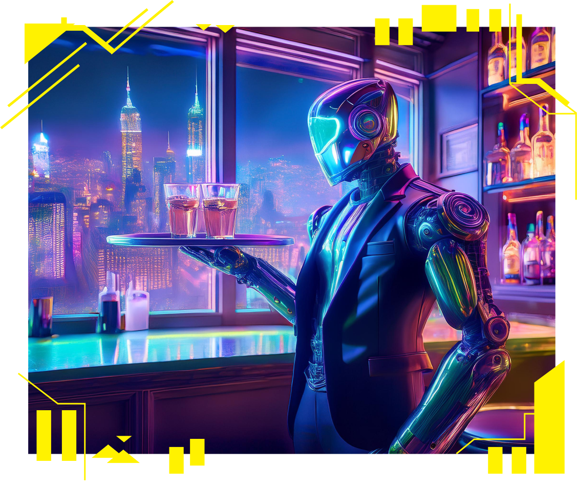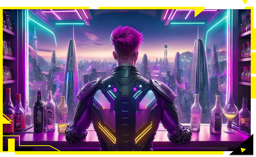 Welcome to Overclock Bar. A experience of a lifetime, stepping into a world beyond ours. Acquaint yourself to the future with a cyberpunk retro-futurism aesthetic, full to the brim of robot servants, loud music, bright screens, hanging wires and neon head to toe.