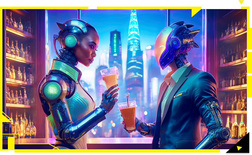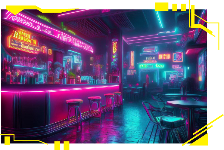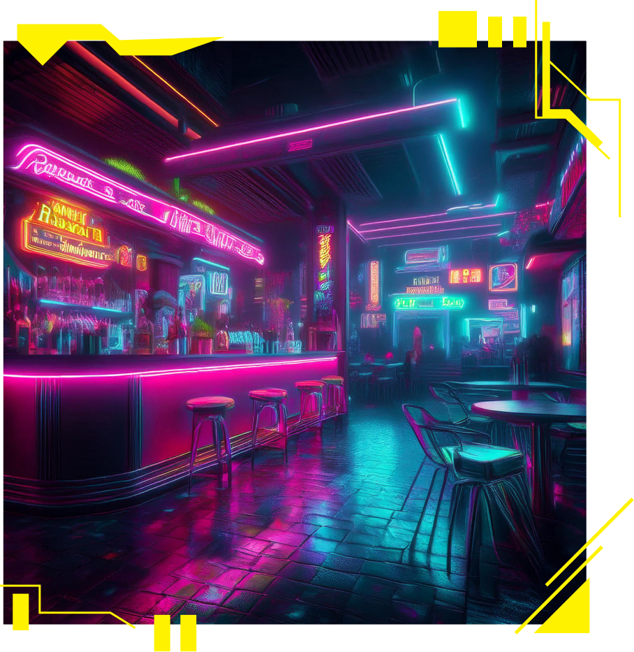 Welcome to Overclock Bar. A experience of a lifetime, stepping into a world beyond ours. Acquaint yourself to the future with a cyberpunk retro-futurism aesthetic, full to the brim of robot servants, loud music, bright screens, hanging wires and neon head to toe. Interested in our story? Or just the vibe? Come on in, we'd love to install some new upgrades.